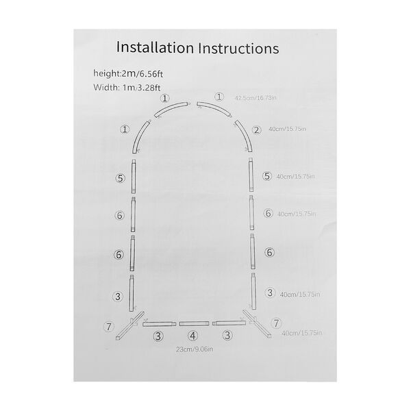 The arch is made of metal and finished in a white colour. It features a classic arch shape with a sturdy base that will stand on tiles, carpets, cement or even grass without toppling over. The arch comes in pieces and some simple assembly is required to put it together. It stands 2m tall and 1m wide. You can use the arch both indoors and outdoors. After use, it can be packed up and stored away, taking up minimal space.