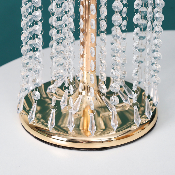 The stands come in a set of two. Each stand is made of metal and finished in a luxurious gold colour. The stand has a round, flat sturdy base that supports it, ensuring that it will never topple over. Rising up from the base is a gold stem that reaches 90cm high. Draped down from the top of the stand are a myriad of strands of acrylic crystal beads, forming a beautiful circular curtain.