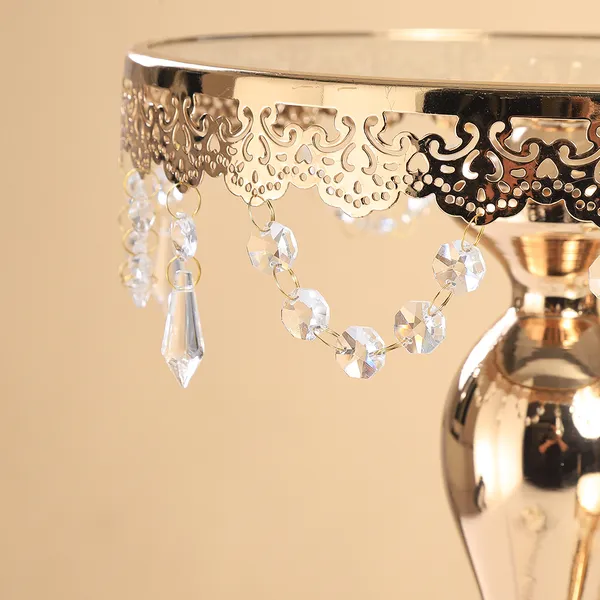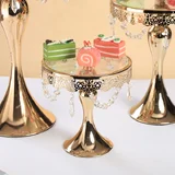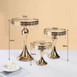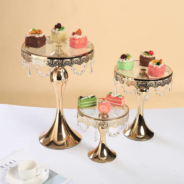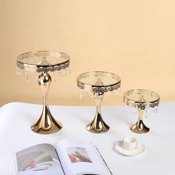 3PC Gold Wedding Metal And Glass Lace Cupcake Cake Stand With Crystal Pendant Chain