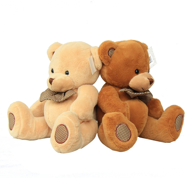 The Teddy Bears come in a bulk pack of 6 in assorted colours of beige and brown. Each bear is in a sitting position and has a height of 25.4cm. The bear has decorative accents of polka dot fabric on his ears, feet and tied around his neck as a bow tie.