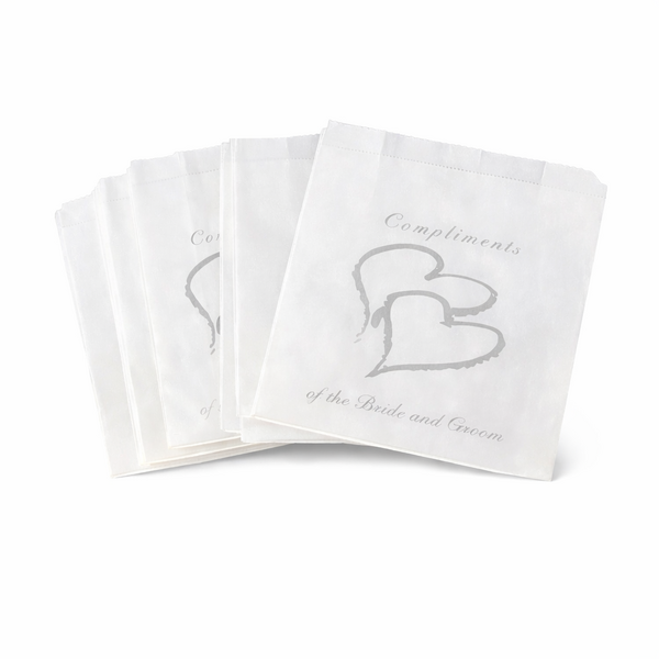 - Words ‘Compliments of the Bride and Groom’ printed onto each bag in silver lettering
