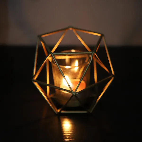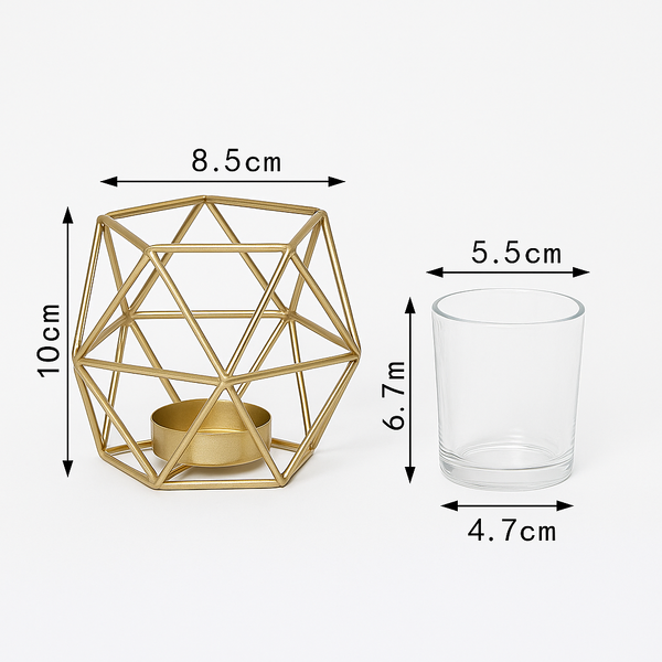 The tealight holder is made of metal and finished in a magnificent gold colour. The design features a modern geometric pentagon shape of triangles in a open-work pattern. At the base of the holder is a round matching gold metal plate that will hold a standard tealight candle or a votive. The open design allows for optimum ventilation and the holder will not get hot.