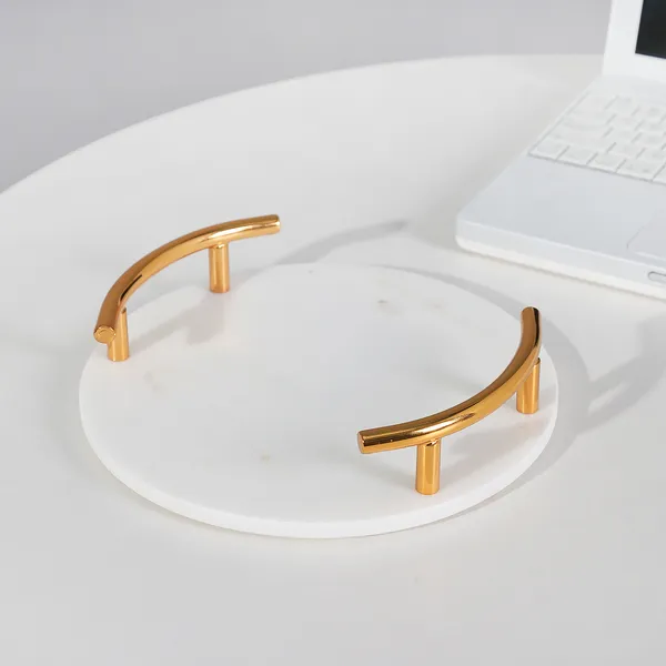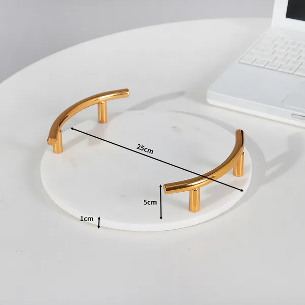 The trays are made of white marble and have a diameter of 25cm and a depth of 1cm. Attached to the marble base are two handles, 5cm high, finished in a stunning gold colour. The design is modern and on-point, with the handles partially enclosing the sides of the cupcake stand.