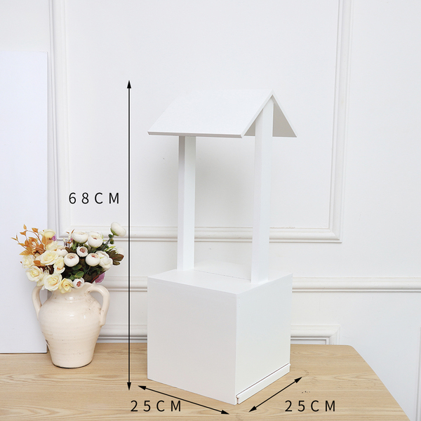 Our beautiful Gift Card Box is the perfect solution to this problem. It is made of wood and finished in a lovely white colour. The box features a classic Wishing Well shape with a cottage style roof at the top, upheld by two side poles. The box stands on the floor and has a slot in the front for posting in cards, envelopes and letters where they will all be safe and in contained one place. The box is sized at a manageable H65cm x L25cm x W25cm, making it easy to pick up and transport when your event is over.